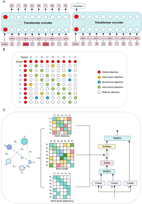 为突破现有模型的局限,研究团队提出了GEO-BERT模型,将分子的三维几何信息(原子间距离、键角等)引入Transformer架构中。该模型以原子和化学键作为独立分词(Token),构建了三种连接关系:原子-原子、键-键、原子-键,并在注意力机制中引入三种空间矩阵:原子距离矩阵、键角矩阵和原子-键邻接矩阵。通过这种设计,模型能够在每一层注意力计算中同时关注分子的语义结构与空间构象,从而提升分子表征的准确性与泛化性能。