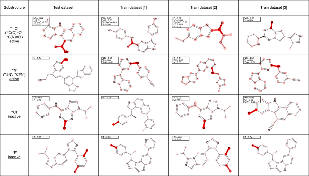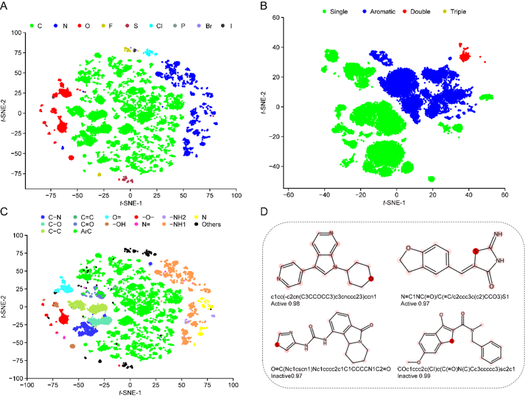 (1)模型的可解释性。如图3所示,。研究团队应用t-SNE技术分别展示了不同原子类型、化学键类型以及原子簇的嵌入向量分布情况,揭示了模型在学习分子结构时的区分能力。此外,研究团队还展示了模型在代表性分子上的注意力分布,表明GEO-BERT能够有效识别分子中关键原子或原子簇,为后续药效机制研究提供了依据。如图4所示,研究团队选取了数据集中的活性分子与非活性分子并进行对比分析,结果显示模型在能够准确定位活性分子中具有代表性的官能团或关键结构片段,也可呈现出非活性分子的不同于活性分子注意力分布。这一发现不仅验证了模型的判别能力,也为药物设计中的结构优化提供可视化参考。