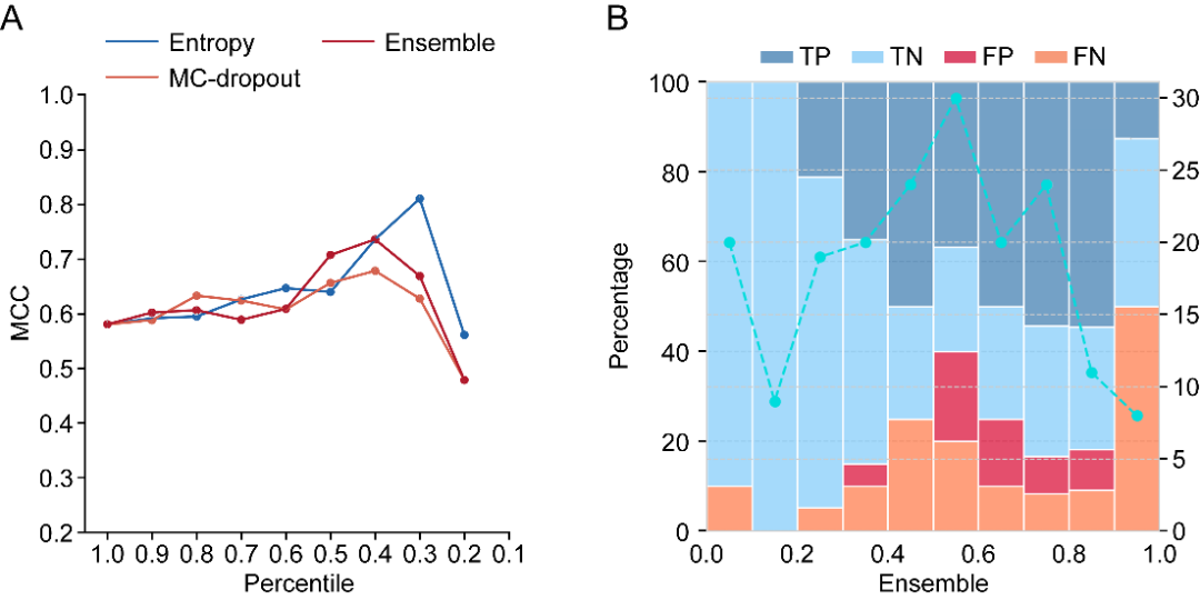 (2)模型可靠性评估。研究团队对GEO-BERT的不确定性进行了系统分析。研究采用熵、蒙特卡罗丢弃法以及集成方法三种策略,量化模型在不同预测置信度下的表现。结果表明模型在低不确定性区间内预测更为准确,而高不确定性区间则提示潜在的误判风险。该分析为后续药物筛选中的风险控制与决策支持提供了重要依据。