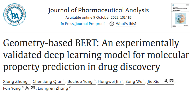 Xiang Zhang, Chenliang Qian, Bochao Yang,Hongwei Jin, Song Wu,Jie Xia*, Fan Yang* and Liangren Zhang. Geometry-based BERT: An experimentally validated deep learning model for molecular property prediction in drug discovery. Journal of Pharmaceutical Analysis. 2025: 101465.