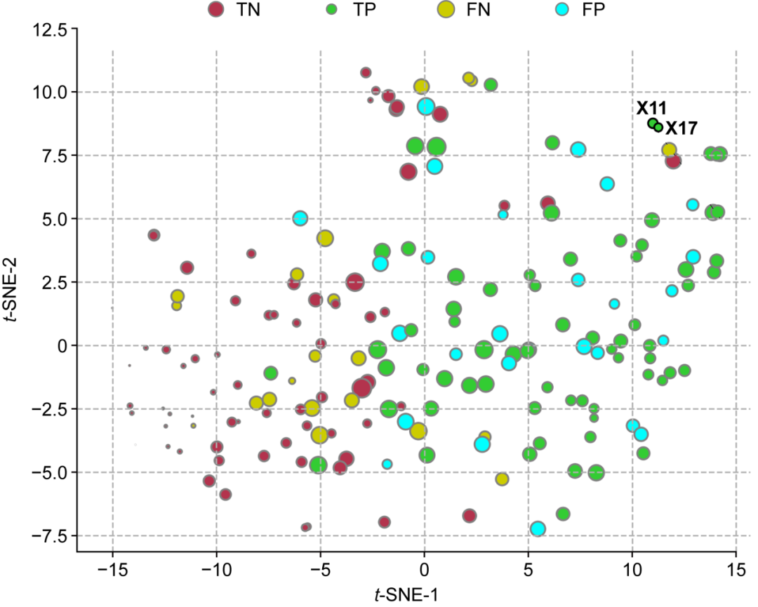 研究团队进一步利用t-SNE方法对新发现的DYRK1A抑制剂进行了可视化展示。图8中不同颜色的点代表不同类型的预测结果,点的大小则表示每个样本的不确定性值(由集成方法计算)。该图不仅揭示了模型预测高活性分子X11与X17的可靠性,也表明两个分子的结构区别于已知分子因而具有结构新颖性。