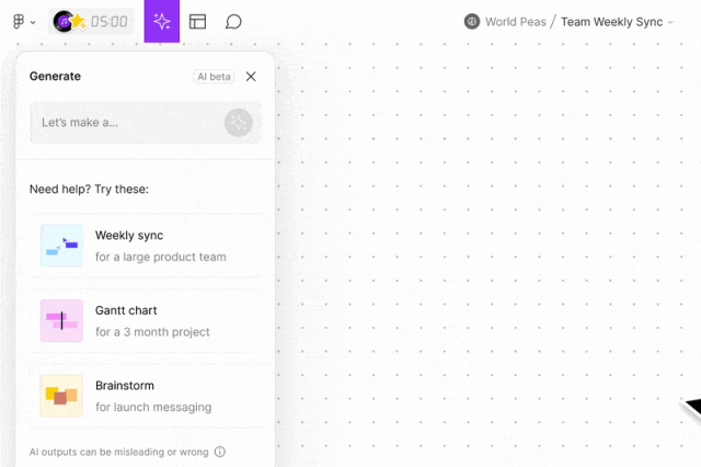 FigJam,一款协作白板,专为头脑风暴、创意构想和快速沟通而设计。它内置计时器、投票和表情反馈,并通过AI提供模板生成和笔记总结功能。