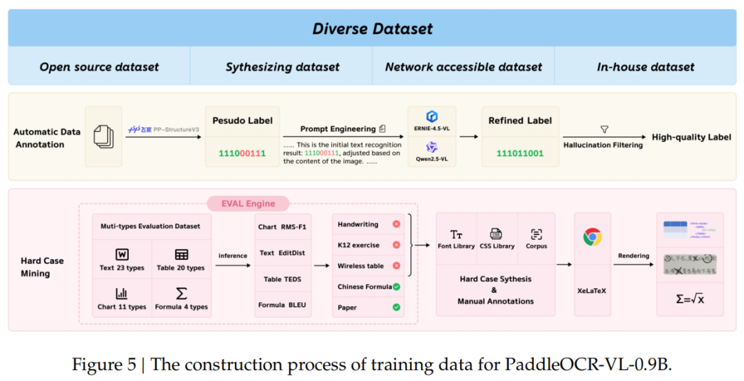 这些训练数据涵盖文本、表格、公式、图表等多模态信息,数据来源包括公开数据、自动合成数据、互联网采样数据和百度自研数据,辅以难例挖掘机制,保证训练集的多样性和挑战性。