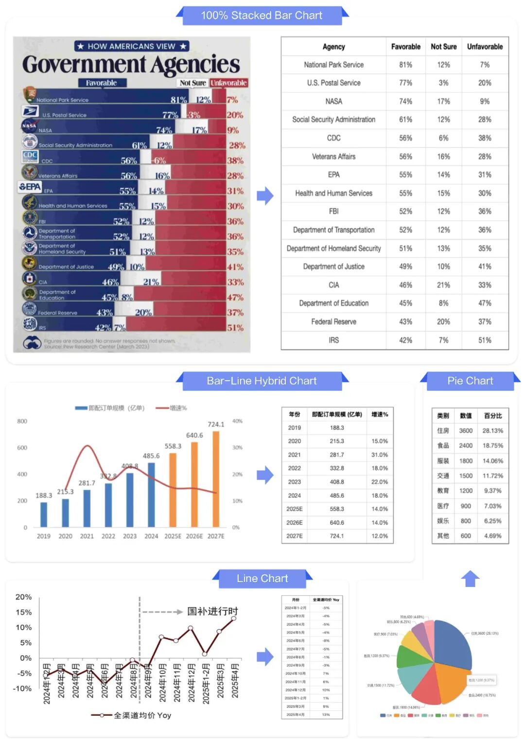 比如现在新闻、报表中经常会碰到的图表,处理起来同样是小菜一碟: