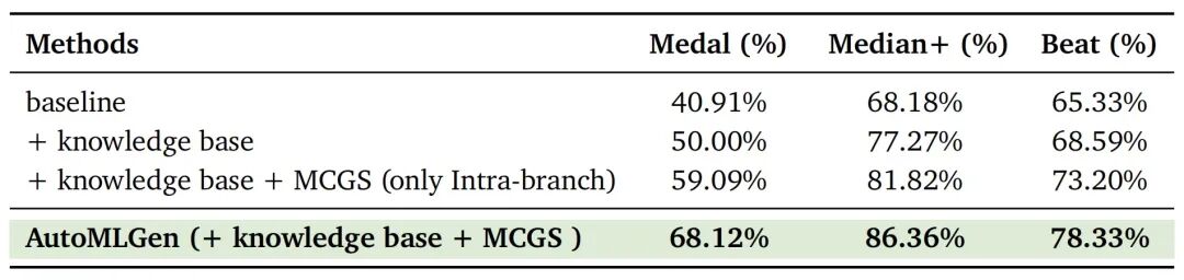 在高难度任务中,AutoMLGen在多数竞赛中取得领先,进一步证明其在复杂场景下的稳定与进化能力。