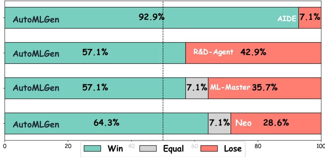 AutoMLGen在仅使用DeepSeek-R1模型的情况下,以36.4%的平均奖牌率和18.7%的金牌率登顶MLE-Bench榜单,用标准时长一半(12小时)的计算预算实现“更准、更快、更省”,体现了AI智能体从“代码生成”到“算法优化”能力的转变。