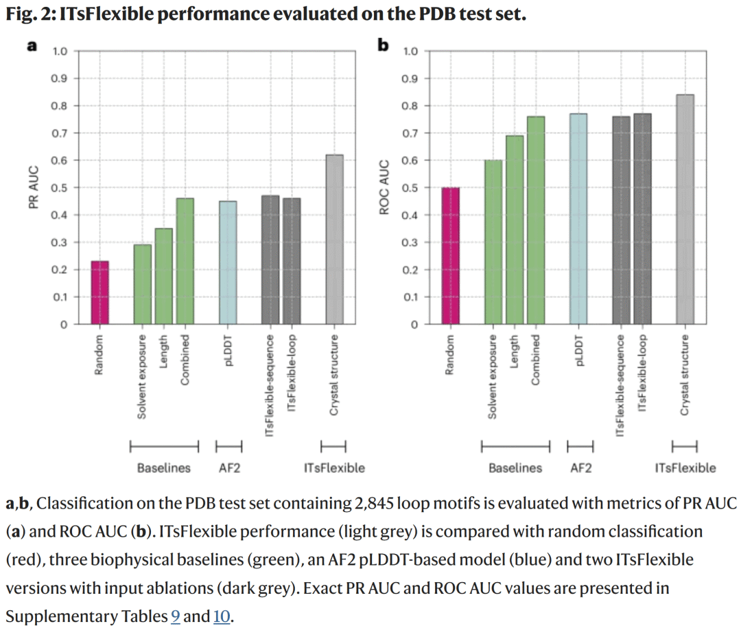 在 PDB 测试集中,ITsFlexible 的 ROC AUC 达到 0.84,PR AUC 为 0.62,显著优于所有基线与零样本方法(图2)。模型消融实验显示,仅使用环序列或局部结构的模型性能下降,说明环与其环境的相互作用是柔性的重要决定因素。