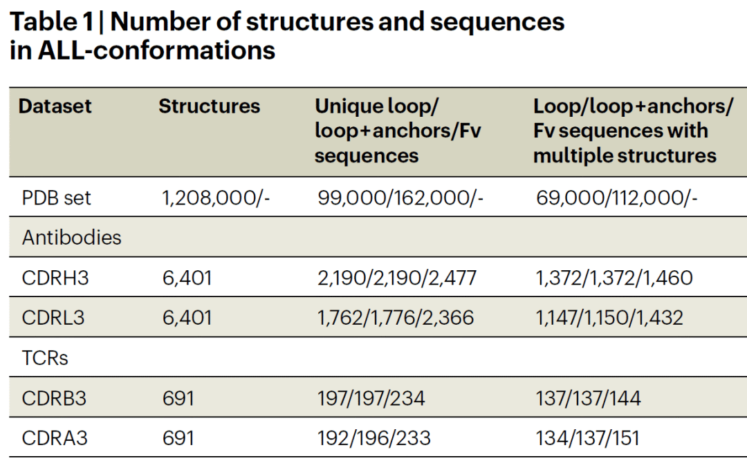 研究人员从 PDB 中系统挖掘由两条反平行 β 链包围的环状结构,形成 ALL-conformations 数据集,包含五个子集:抗体 CDRH3、CDRL3、TCR CDRB3、CDRA3 以及所有蛋白中的类似环结构。该数据集共含 120 万个晶体结构,约 10 万条独特序列,覆盖了实验观察到的全部构象状态。