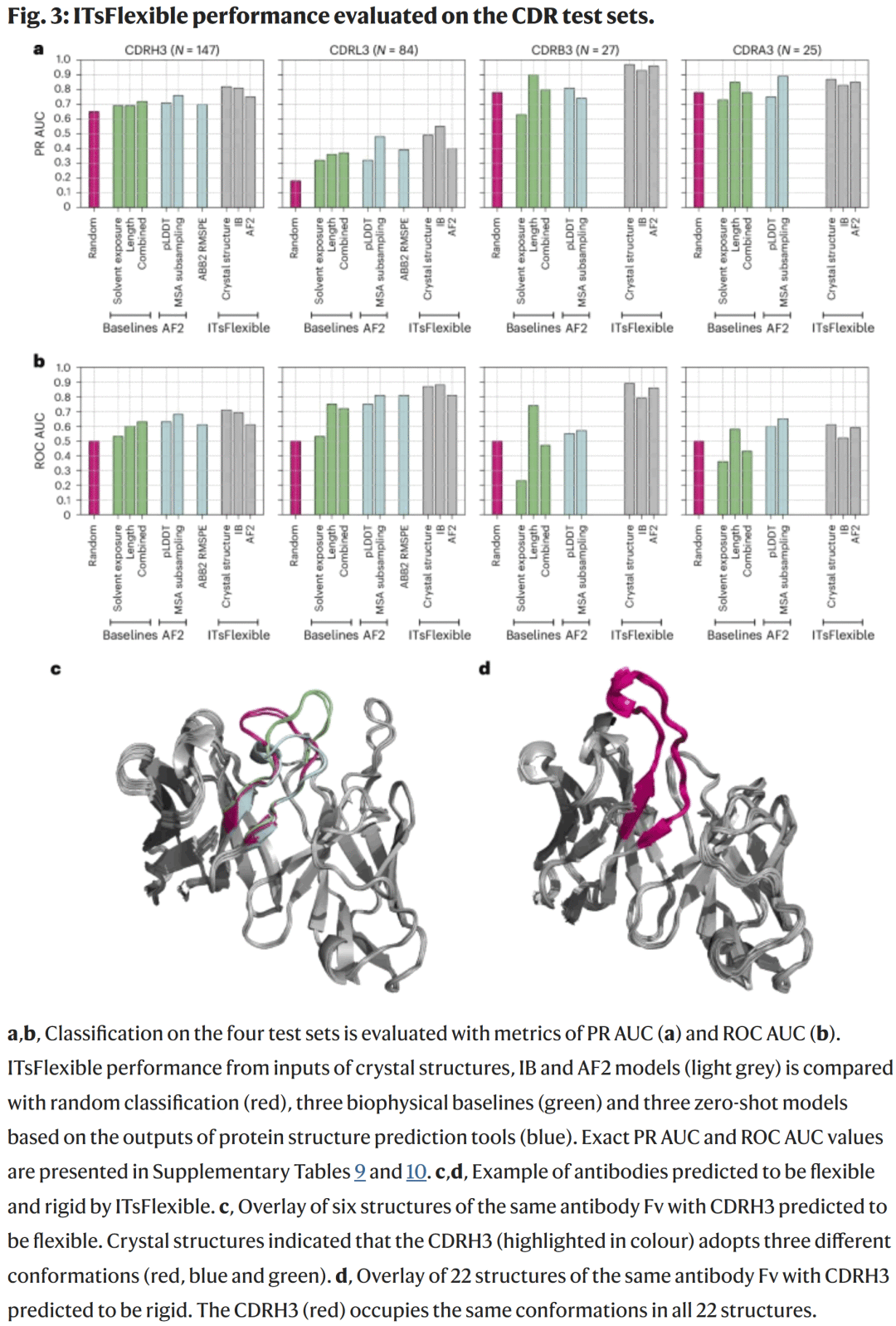 研究人员通过构建 ALL-conformations 数据集与 ITsFlexible 模型,实现了对CDR3柔性的高精度预测。该方法揭示: