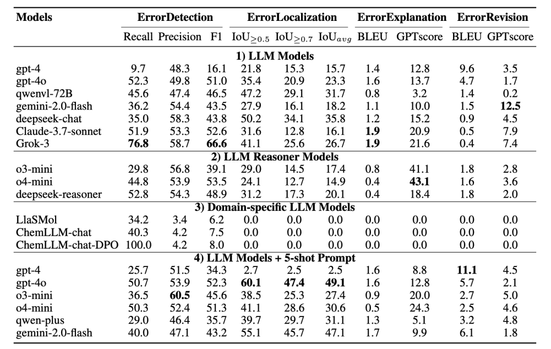 这套“从发现到修正”的链式流程,模拟了科研人员审阅论文、修改实验报告的真实过程。MolErr2Fix 不仅考查模型的生成能力,更考查其逻辑一致性与科学推理能力。