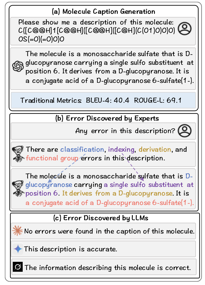 随着 GPT-4、Claude、Gemini 等大模型的迅速发展,它们在分子描述生成(molecule captioning)、反应预测、药物设计等任务中展现出惊人的语言与模式学习能力。然而,研究者很快发现:这些模型往往能生成流畅自然的分子描述文本,但其内容在化学上却存在明显错误。