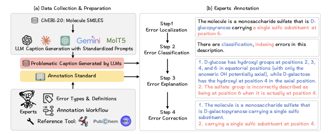 这些分子样本来源于 ChEBI-20 数据库中小于 100 个原子的分子,涵盖糖类、甾体、芳香化合物、酯类及胺类等常见结构类型。在标注过程中,研究者有意引入了多种“语言正确但化学错误”的描述样例。例如: