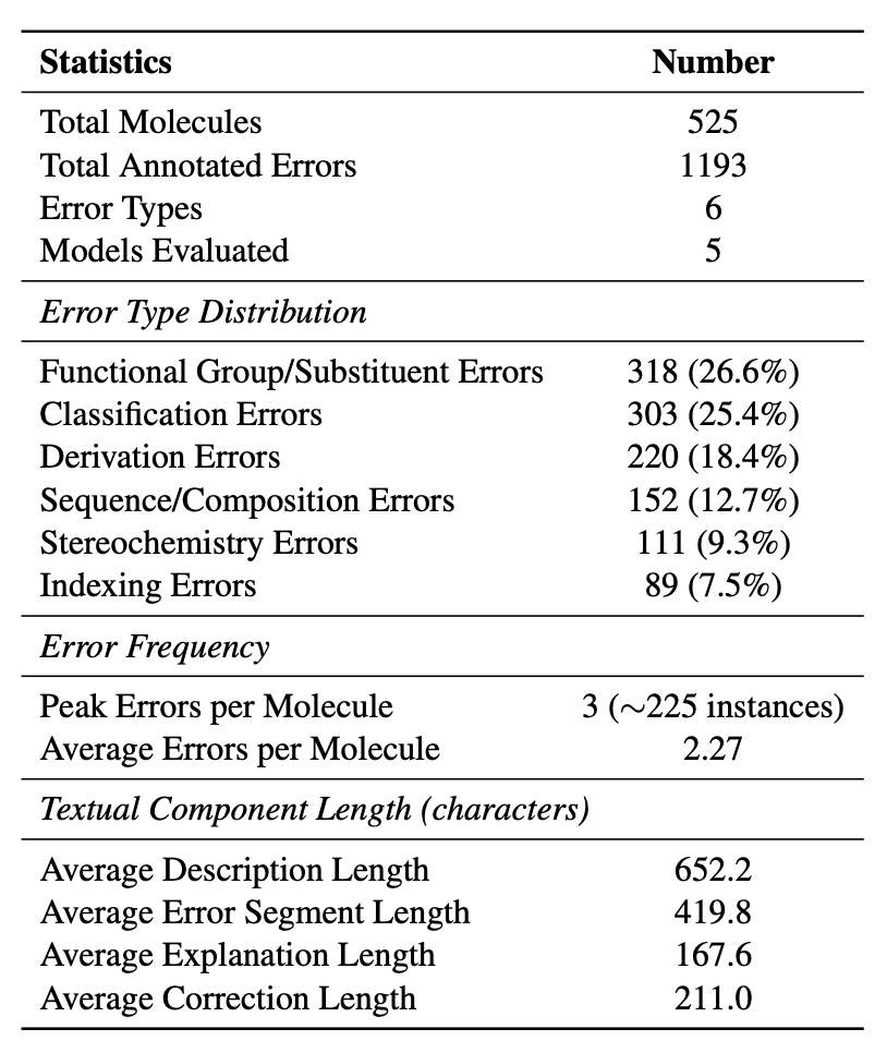 MolErr2Fix 数据集共包含 525 个分子、1,193 条精标错误实例。每个实例由三位具备有机化学背景的专家独立标注,注释内容包括:(错误类型、错误位置、错误解释、正确修复)
