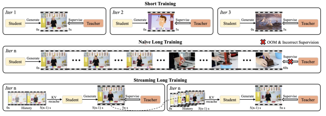 现在,很多扩散模型的做法由于双向注意力机制导致长时域生成过慢。而另一些则是「把一段视频一段视频分别生成然后拼起来」,所以越长越崩,人物形象完全错误,还有一些方法由于训练阶段使用短视频,推理阶段则推长视频导致训推不一致。