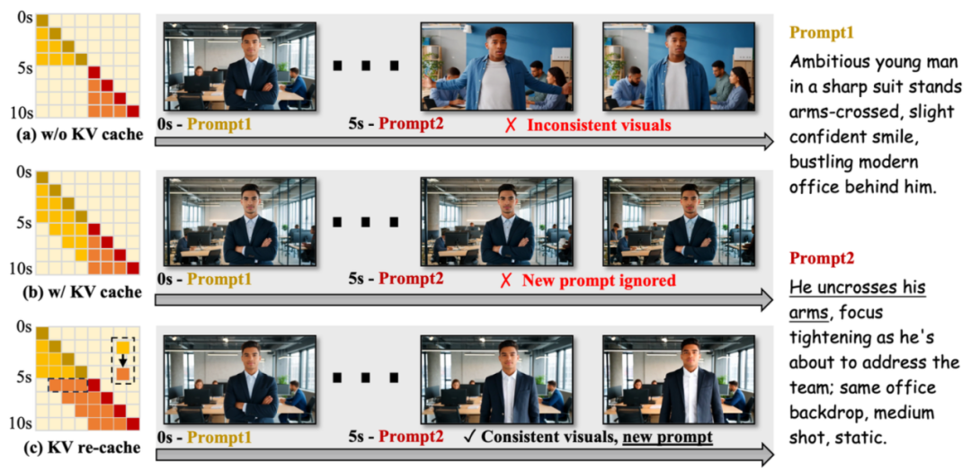 图3:不同策略对比来看,LongLive提出的KV re-cahce完美解决所有痛点