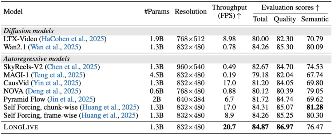 表2:LongLive在VBench 短视频评测榜单上的性能比较
