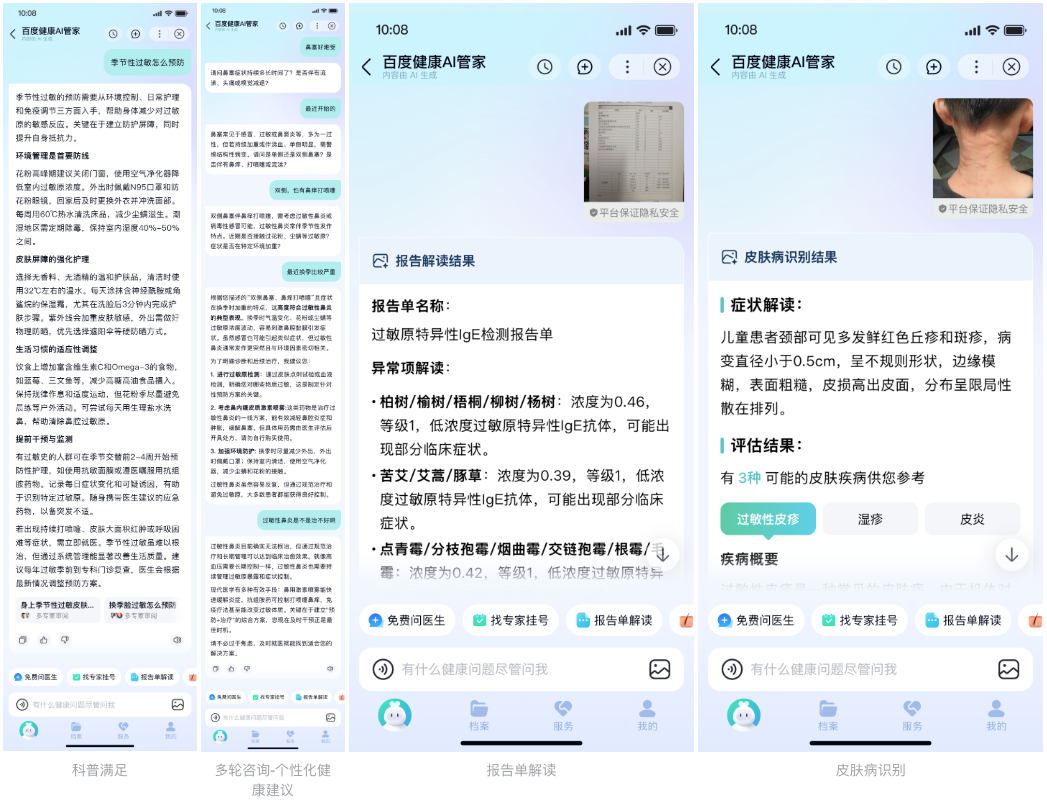 从用户打开百度健康AI管家进行健康咨询,到获得诊断建议、预约挂号,再到管理个人健康档案,每一个环节都有相应的AI应用提供支持。