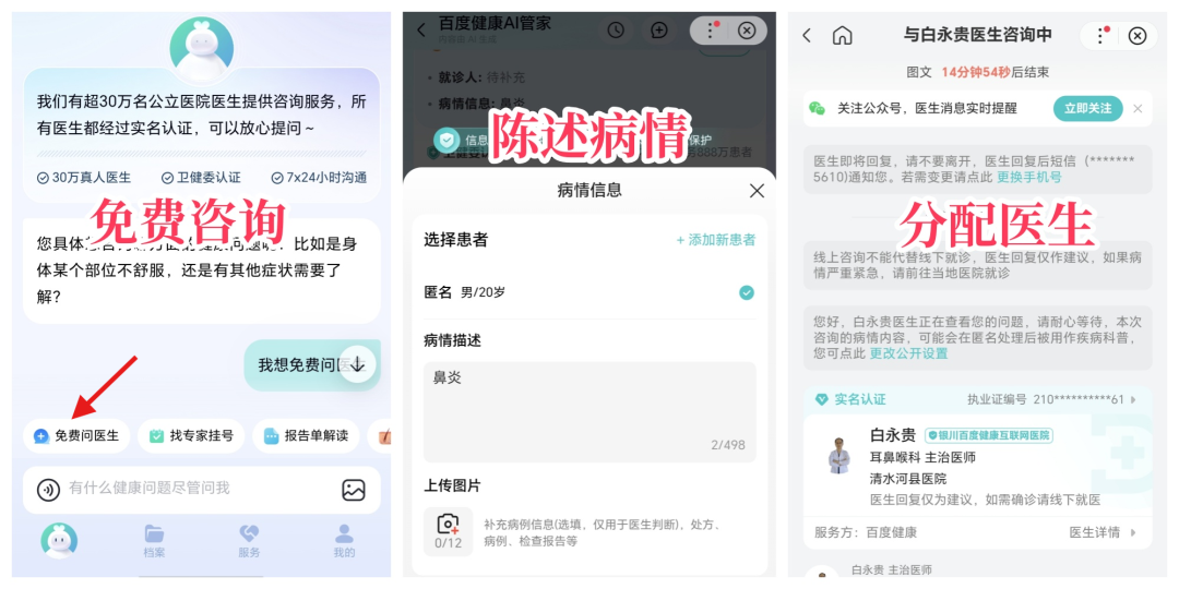 当然了,如果不想花钱挂专家号,这个AI也提供“免费问医生”服务。