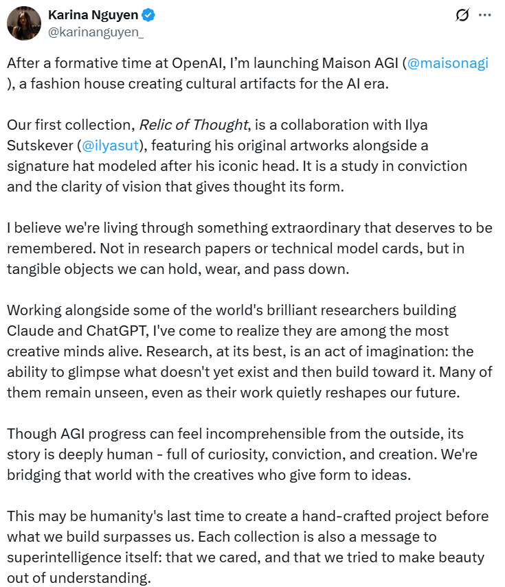 Karina Nguyen,前OpenAI研究员,在X上宣布创立Maison AGI,一个「为AI时代打造文化遗物」的时尚品牌。