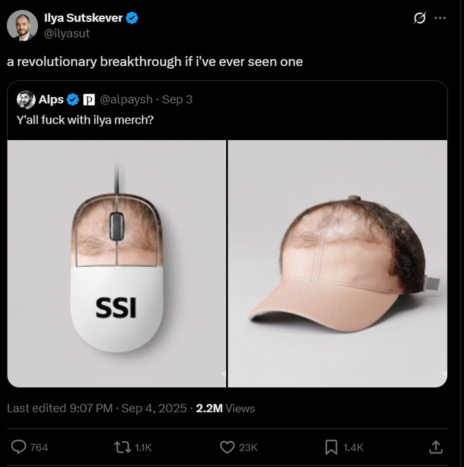 2025年9月,一位网友在X上发布了一张恶搞图,左边是印着Ilya发际线的鼠标,右边是一顶相同发际线的棒球帽。
