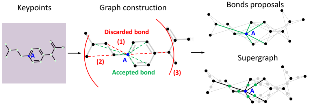 超图构建。该图展示了原子 A 的键合方案的构建过程。考虑的键合用虚线表示。绿色键在超图中被接受,而红色键被丢弃,因为:(1) 它们的中心点周围没有填充像素,或 (2) 它们被其他关键点遮挡。