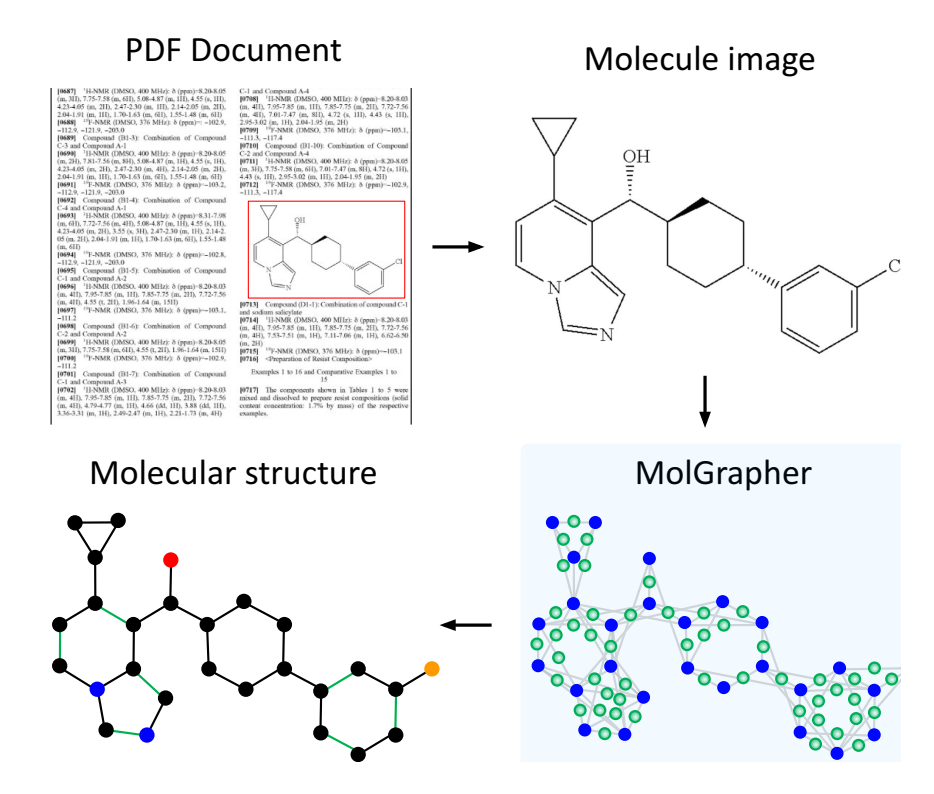 化学领域的多模态文档理解旨在将非结构化文档(例如专利文献、科学论文、书籍和公司文档)转换为结构化的机器可读格式,从而统一化学知识。这种统一的知识能够实现文献的高级分析和机器学习模型的训练。