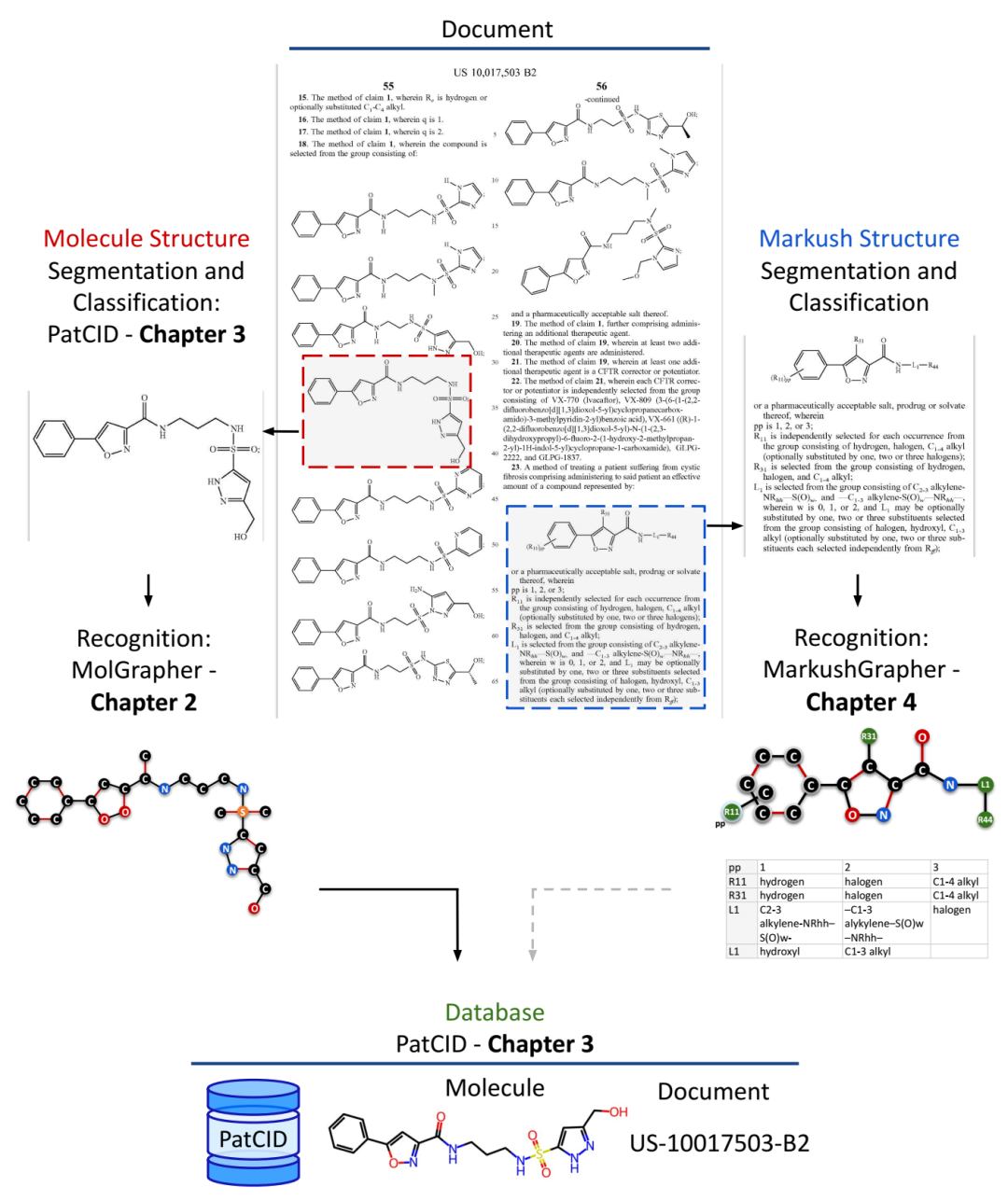 论文概述。专利文献示例页,包含化学结构图像和马库什结构。本论文分为三个主要章节。第二章介绍了一种用于识别化学结构图像的模型。第三章展示了一个从专利文献中提取的化学结构数据库,以及完整的文档到分子的转换流程。第四章提出了一种用于识别马库什结构的模型。