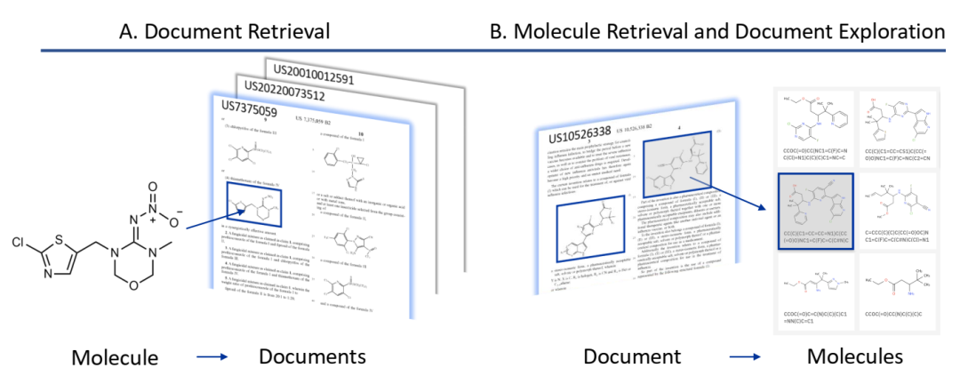 PatCID 用于文档和分子检索。PatCID 可以 (A)通过相似性、子结构或原图检索,检索与查询分子相关的专利文献。它还可以 (B) 检索文档中包含的分子,并用于交互式探索文档集合。