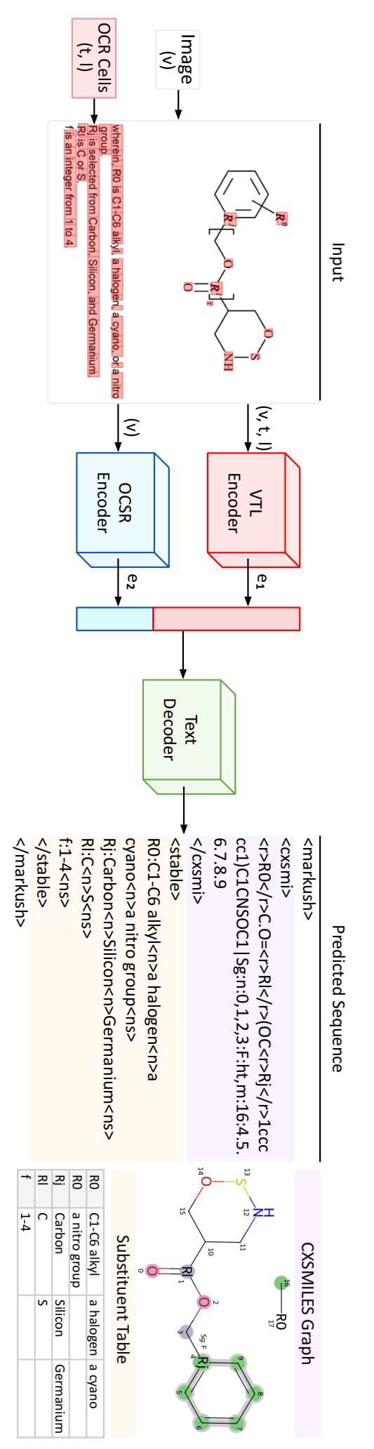 马库什结构识别架构。MarkushGrapher 使用 VTL 编码器(蓝色)和 OCSR 编码器(红色)对输入图像及其文本进行联合编码。VTL 输出 (e1) 和 OCSR 输出 (e2) 连接在一起。最后,此联合编码经过文本解码器处理,预测马库什骨架(紫色)及其取代基表(橙色)的顺序表示。