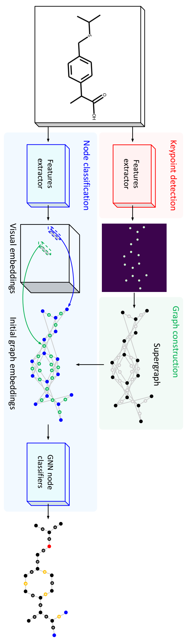 分子图识别架构。我们展示了 MolGrapher 的架构,这是一个基于图的网络,用于光学化学结构识别。关键点检测器(红色)定位分子中的原子节点。构建包含原子和键候选的超图(绿色)。使用图神经网络(蓝色)对原子和键进行分类。