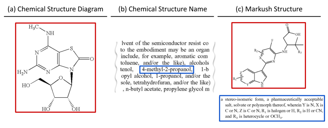 化学结构表示。文献中使用的化学结构有多种表示方式。单个分子可以用以下方式表示:(a) 化学结构图或 (b) 文中的名称。(c) 描述一类相关分子的马库什结构,可以用图像和文本描述表示。视觉表示用红色表示。文本表示用蓝色表示。