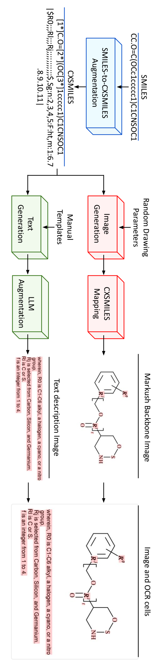 合成训练数据生成。该图展示了生成合成训练样本的流程。首先,从 PubChem 数据库中采样一个分子,并对其进行增强以创建 CXSMILES 库。其次,使用 CXSMILES 库联合生成马库什骨架及其 OCR 单元的图像(红色),以及文本描述及其 OCR 单元的图像(绿色)。最后,整理图像以创建训练样本。