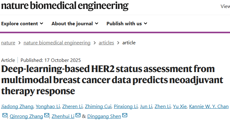 Zhang, J., Li, Y., Li, Z. et al. Deep-learning-based HER2 status assessment from multimodal breast cancer data predicts neoadjuvant therapy response. Nat. Biomed. Eng (2025).