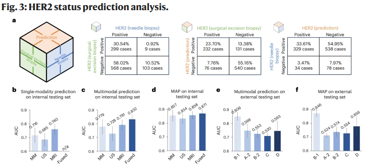 在外部测试集(不同医院数据)上,MAP模型依然保持较高的鲁棒性(AUC≈0.846),显著优于单模态或传统方法。与针吸活检相比,模型预测的HER2状态与手术切除活检结果的一致性明显更高(阳性一致率23.7%,阴性一致率55.16%)。