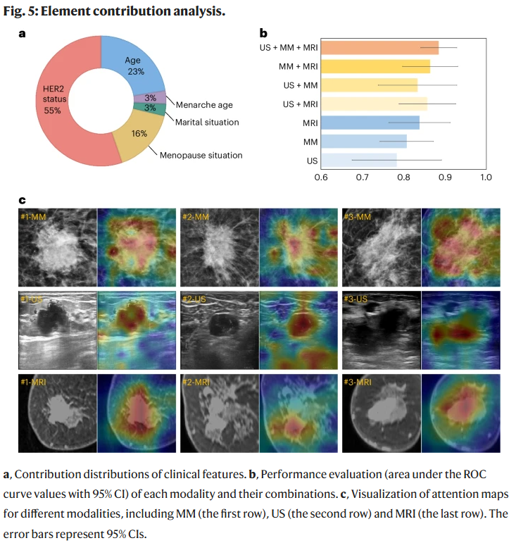 各模态贡献中,MRI提供最丰富的全局信息,乳腺X线捕获微钙化与边缘特征,超声提供局部结构信息;