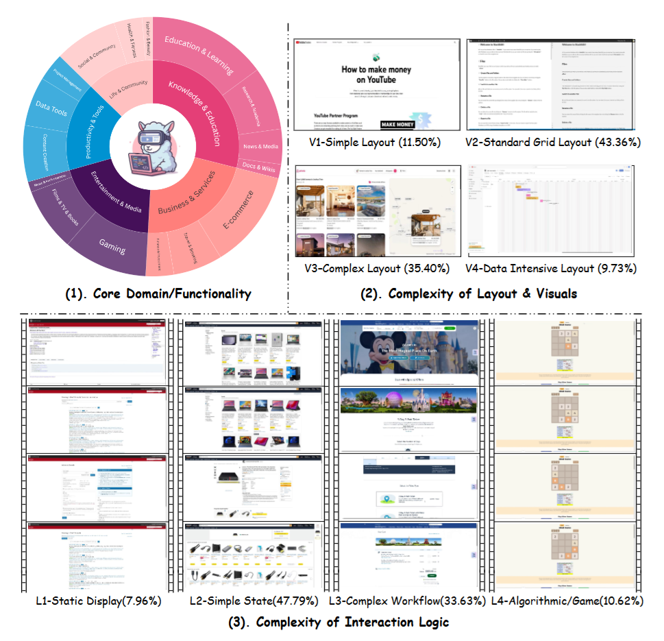 113个来自真实网站的任务,分辨率覆盖桌面与移动端(19种,移动占10.62%) 共1001个交互动作,平均每任务8.9步;其中620个视觉检查点、403个逻辑断言 复杂任务包含2048、扫雷等完整游戏逻辑与GUI重建