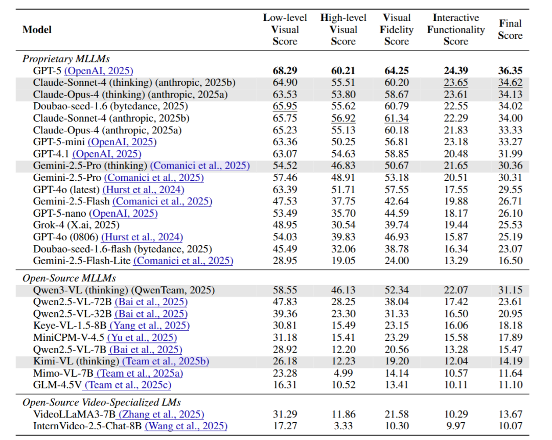 这项任务的难度远超预期。在对28个主流模型的全面测试中,即便是表现最好的模型GPT-5,其综合得分也仅有36.35分。这一结果清晰地指出了当前模型的核心短板,IWR-Bench不仅为领域提供了一个更具挑战性的新目标,也为未来的研究指出了一个新的方向。