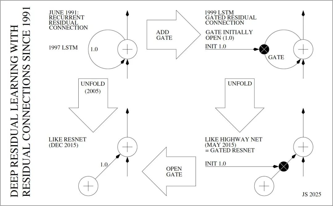 从Hochreiter到ResNet,光芒随时间递归延续。阴影是被模糊的归属,但真理始终不变:1991年的种子闪耀着每一层。