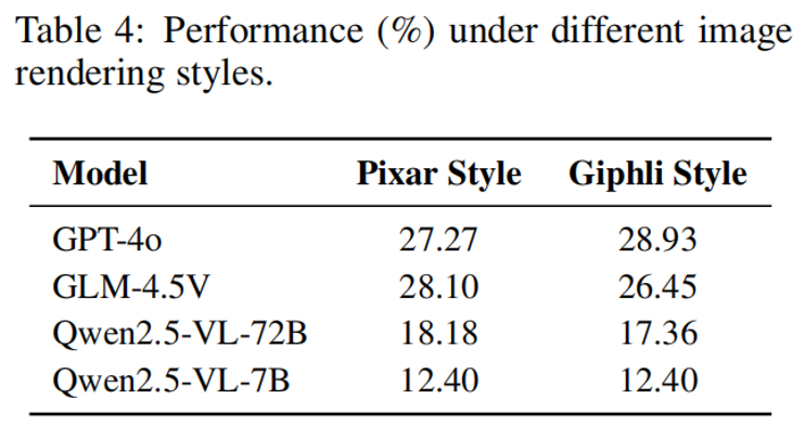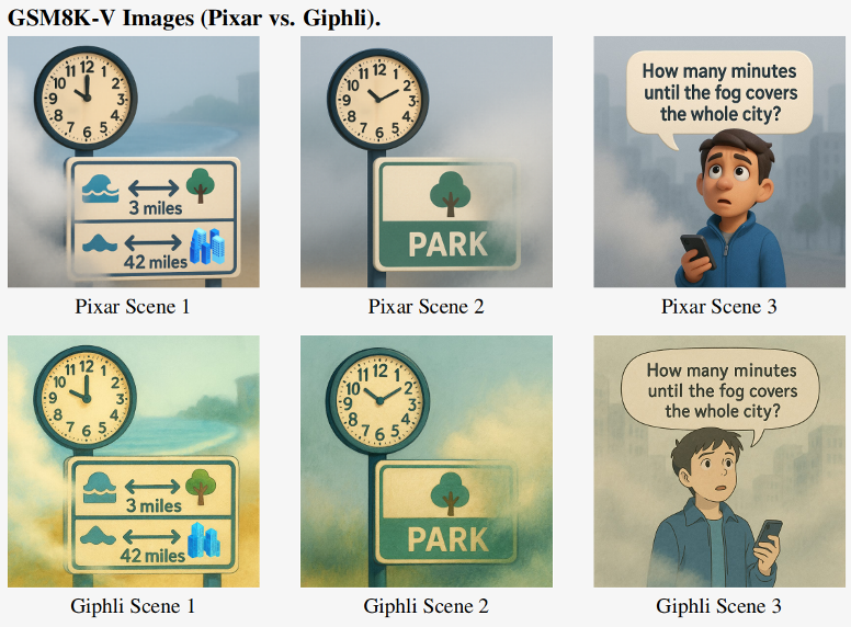 GSM8K-V默认采用Pixar风格的视觉渲染,以保证图像清晰、光影自然、语义明确。为检验模型对图像风格的敏感性,研究团队在子集上重绘了Giphli风格版本。