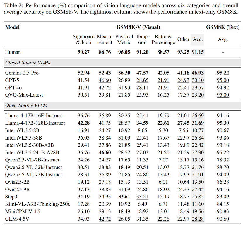 研究团队在GSM8K-V上系统评测了19个主流视觉语言模型,包括闭源模型Gemini-2.5-Pro、GPT-5,以及开源代表Llama-4、InternVL3.5、Qwen2.5-VL等,全面分析了它们在视觉数学推理任务中的表现。结果揭示了视觉推理任务的巨大挑战性以及人机间显著的差距。