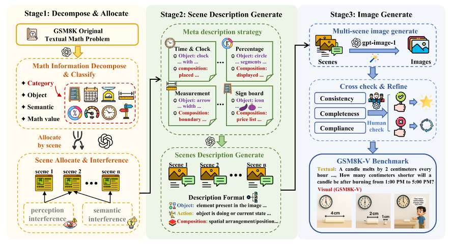 为此,研究团队设计了一套三阶段自动化构建流程,确保视觉题与原始文本题目在语义上一一对应、逻辑一致。