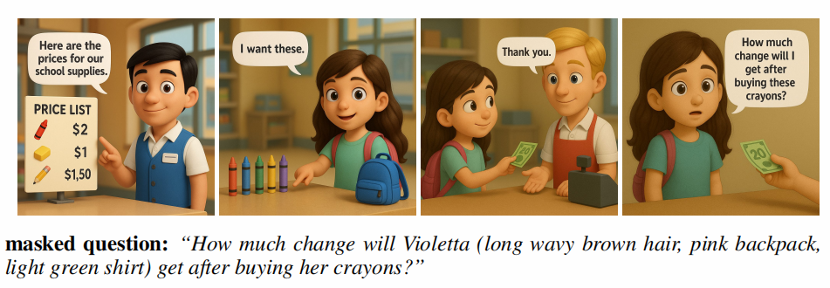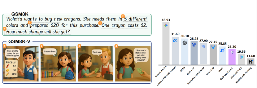 面对这些问题,浙江大学的研究团队提出了GSM8K-V——将广泛使用的数学基准GSM8K系统性地映射为其视觉对应版本,构建出一个跨场景、多图像的视觉数学推理基准。该基准旨在检验模型是否真正能「看得懂」数学,而不仅仅是「读得懂」文字。