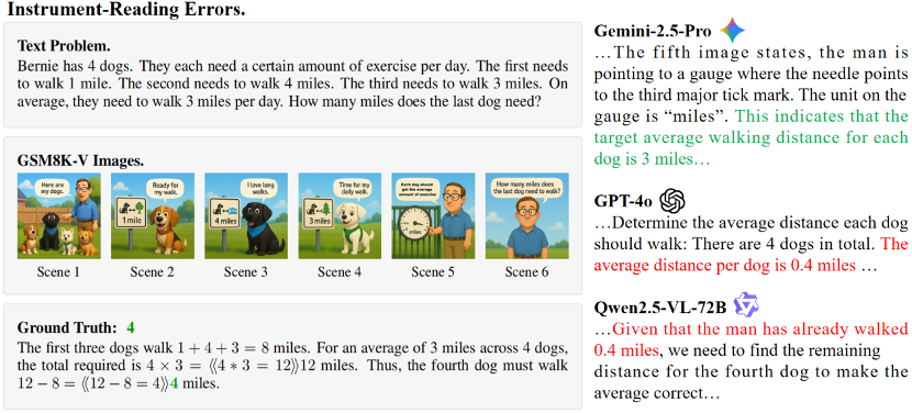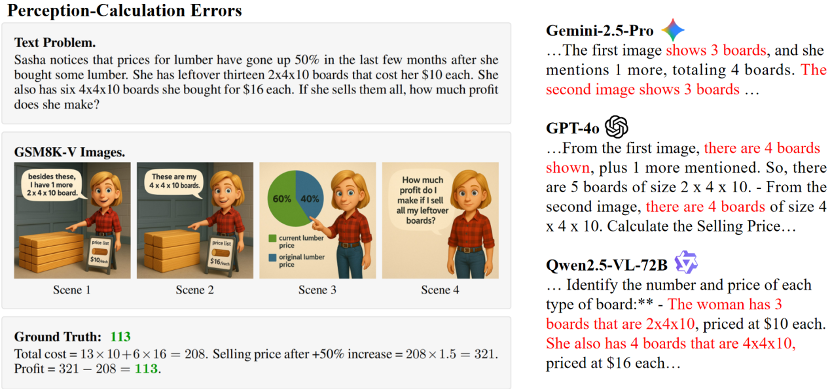 例如,模型可能误判物体数量、混淆计价单位,从而直接导致推理崩溃。这类错误暴露出模型在「视觉计数」与「数值绑定」之间的薄弱环节。