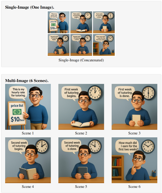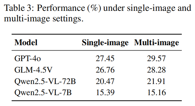 在多图输入场景下,模型平均准确率略高于单图拼接输入。研究表明,将问题分解为多张顺序图像有助于模型保持事件的逻辑与时间顺序,从而更接近人类推理过程。