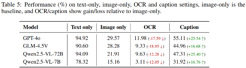 结果表明,OCR模式下性能极低(10%左右),说明模型无法仅通过图像转写的文字获得有效信息,视觉理解在任务中不可或缺。