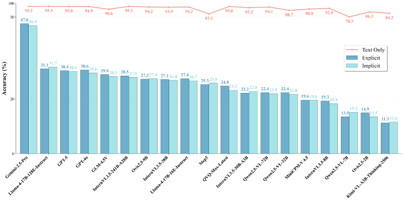 然而,即使在这种「显式」支持下,模型的准确率依然远低于文本任务(例如 Gemini-2.5-Pro:47.6% vs. 95.2%),表明多模态推理尚未实现真正的语义整合。