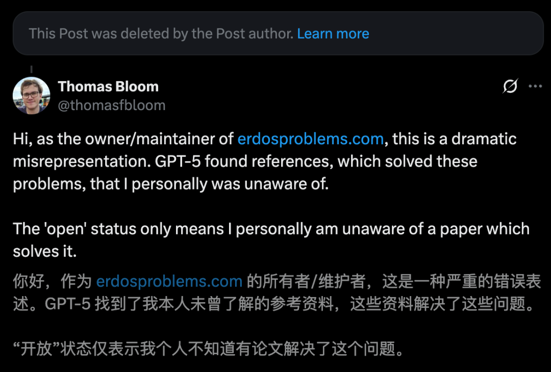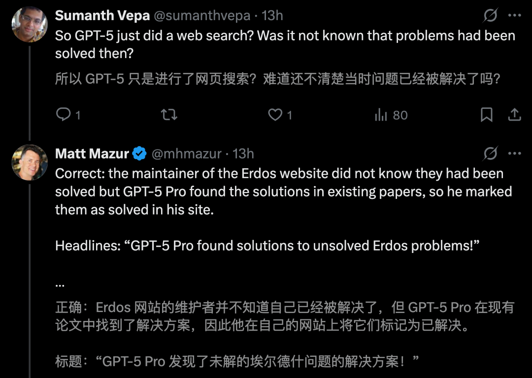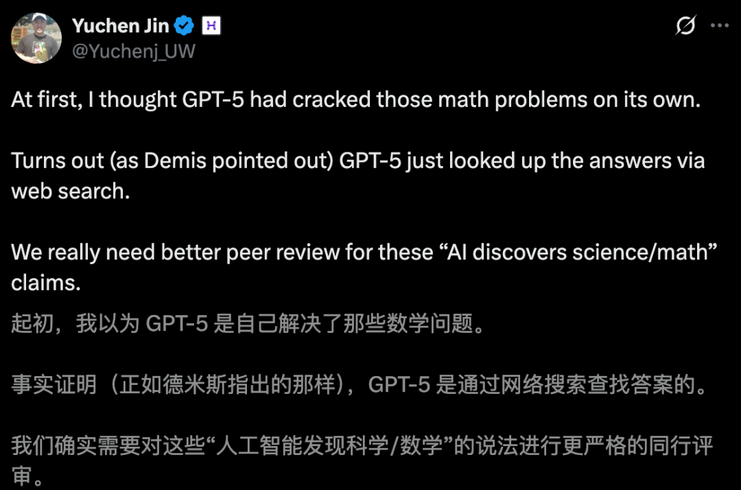 Sebastien Bubeck尴尬回复道,GPT-5只是在文献中找到了解决方案,仅此而已。