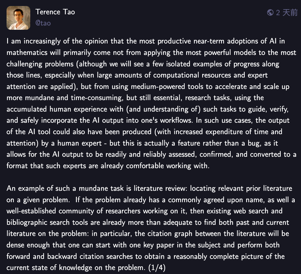 几天前,陶哲轩也曾发文表示,我越来越觉得,眼下AI要在数学领域真正发挥作用,关键可能不在用最牛的模型去攻克最难的题目——