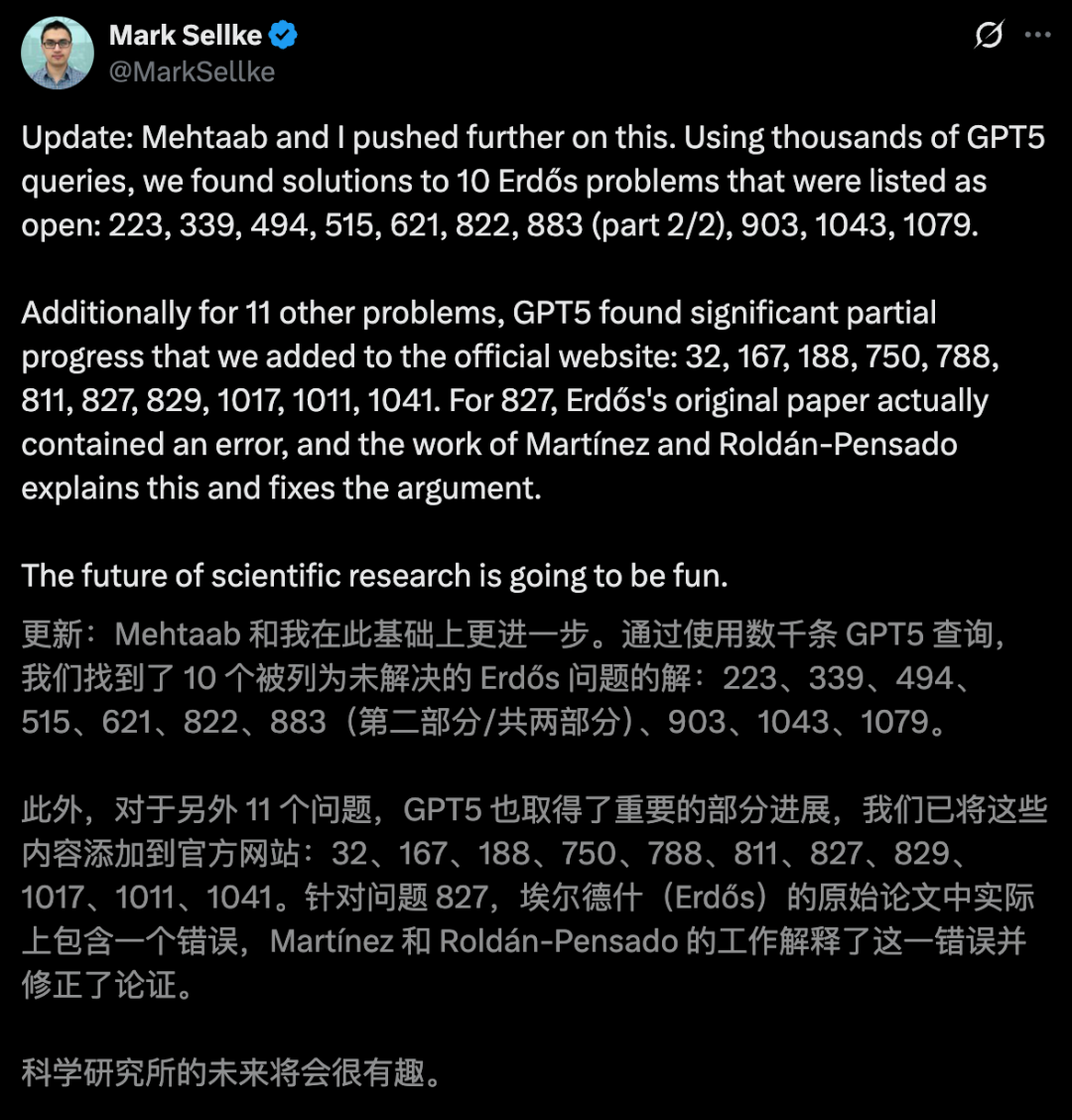 他们原帖是,通过GPT-5数千条查询后,找到了十个被列为Erdos问题的解。
