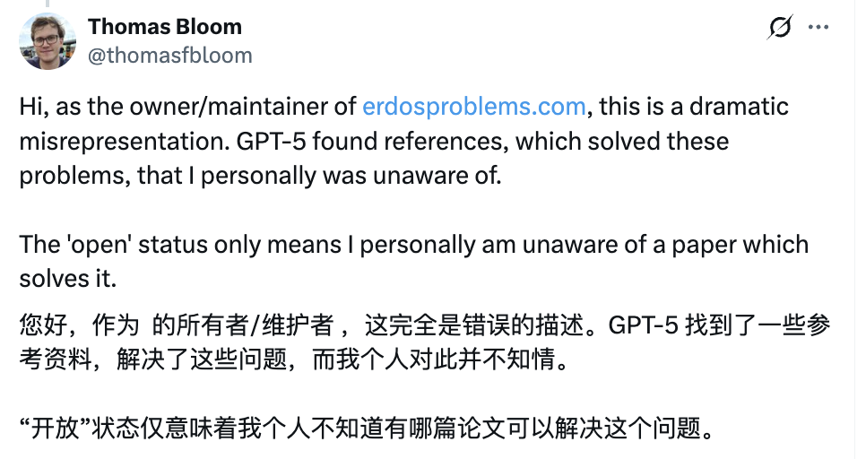 作为erdosproblems .com网站的拥有者和维护者,我得声明:OpenAI的说法明显夸大了事实。GPT-5只是通过网络搜索,找到了早已存在的论文,这些论文中早就解答了这些问题,只是我个人不知道而已。网站上的“未解”状态只是说明我尚未发现相关的论文,而不代表全世界数学界没有解决方案。